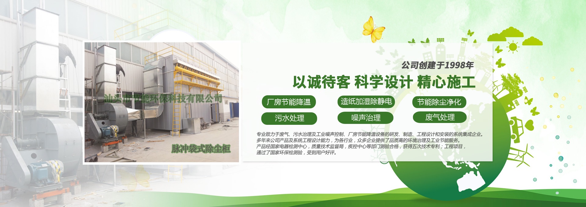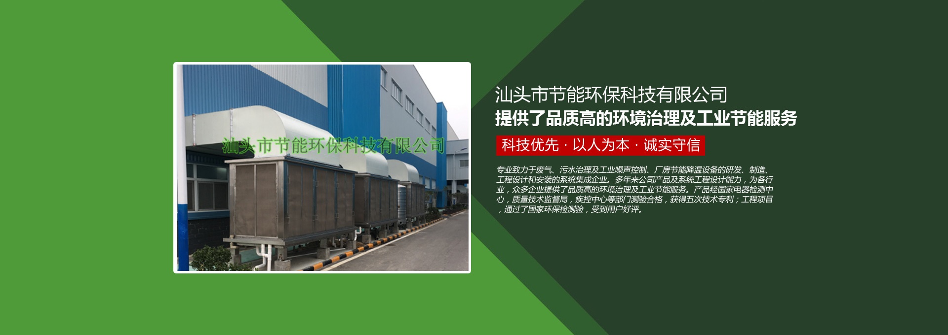 汕頭市節能環保科技有限公司創建于1998年,是一家專業致力于廢氣、污水、粉塵、噪聲治理,廠房節能降溫設備的研發、制造、工程設計和安裝的系統集成企業。多年來公司產品及系統工程設計能力,為各行業,眾多企業提供了品質高的環境治理及工業節能服務。產品經國家電器檢測中心,質量技術監督局,疾控中心等部門測驗合格,獲得五次技術專利;工程項目通過了國家環保檢驗檢測,受到用戶好評。
